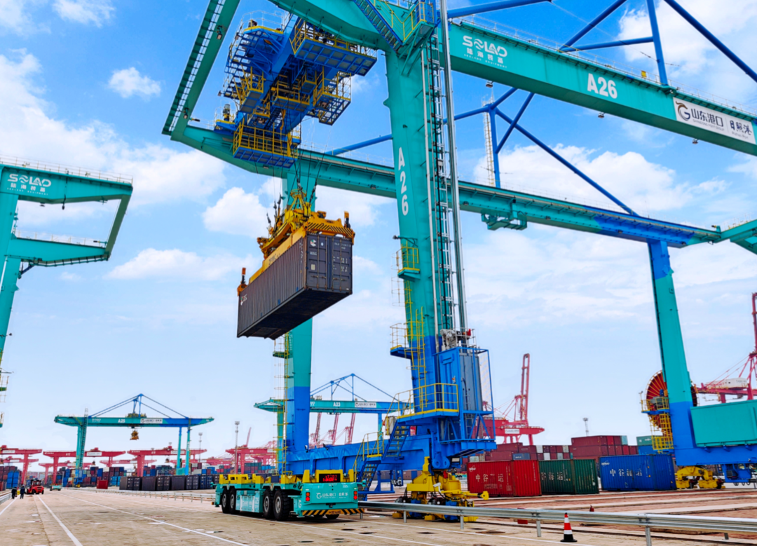 9月29日,在山东港口日照港全自动化集装箱码头,随着A23自动化轨道吊精准将集装箱吊起、转运,标志着日照港研发的新一代双悬臂轻量化轨道吊投产试运行。